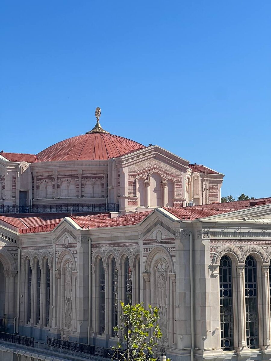 Как только мы прошли КПП, перед нами открылась огромная территория, которая впечатлила не только своими масштабами, но и захватывающим видом на музейно‑храмовый комплекс сверху. Светло-бежевое здание с красной крышей особенно выделяется и прекрасно гармонирует с голубым небом. Так, ещё не прикоснувшись к истории, мы уже во всю ощутили её с первого взгляда.