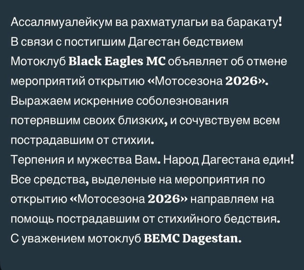 ™: !!! blackeagles_mc Ассалямуалейкум ва рахматулагьи ва баракату! В связи с постигшим Дагестан бедствием Мотоклуб Black Eagles МС объявляет об отмене мероприятий открытию «Мотосезона 2026». Выражаем искренние соболезнования потерявшим своих близких, и сочувствуем всем пострадавшим от стихии. Терпения и мужества Вам. Народ Дагестана един! Все средства, выделеные на мероприятия по открытию «Мотосезона 2026» направляем на помощь пострадавшим от стихийного бедствия. С уважением ВЕМС25