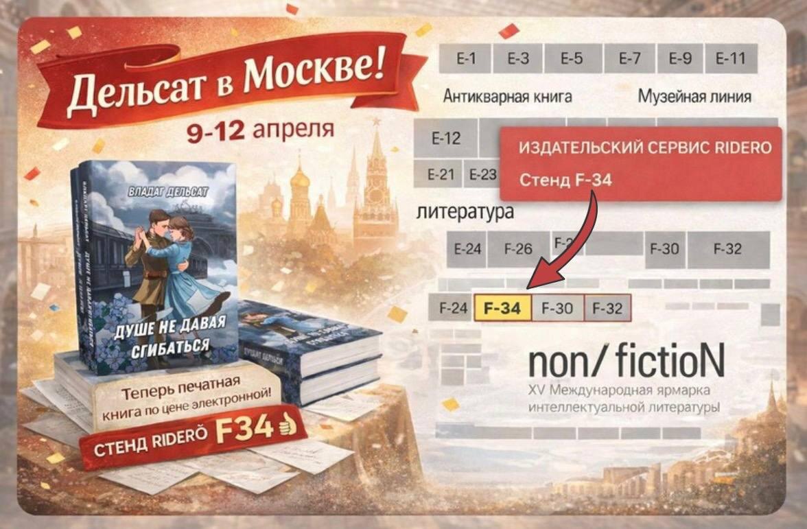 Ну, ладно, не сам Дельсат, а книга. Я-то дома сижу, а вот «Душе не давая сгибаться» с 9 по 12 апреля будет на нонфике, в Гостином дворе, на стенде Rideró. Что за книга — вы, наверное, и так примерно знаете, но все-таки скажу. Это блокадный Ленинград глазами девочки-подростка. Не в смысле «девочка где-то на фоне истории», а в смысле — вот человек идет через войну, голод, потери, через все это черное и взрослое, и каким-то образом не ломается внутренне. Мне эта история очень важна. Теперь совсем практическое. На ярмарке бумажную книгу можно будет взять за 300 рублей. Да, именно бумажную. Да, по цене электронной. Нет, я сам до сих пор считаю, что звучит это подозрительно хорошо. Искать на стенде F-34. Если кто на нонфик собирается, можете заодно и мою книгу навестить. Вдруг вы как раз из тех людей, которые любят уходить с ярмарок не с пустыми руками. Кто когда идет? #издательское