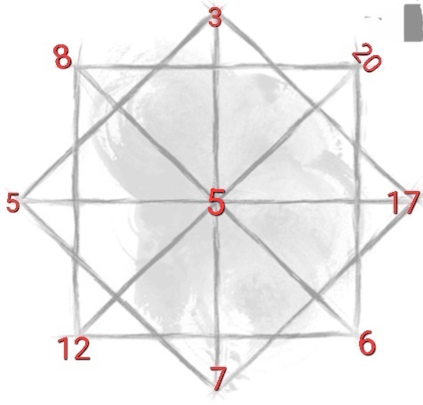 Если посмотреть на матрицу💠, нам уже знакомы две линии - горизонтальная ЗЕМНАЯ🌍 (на рис. она соединяет 5 и 17), вертикальная НЕБЕСНАЯ🌫 (на рис. от 3 до 7).