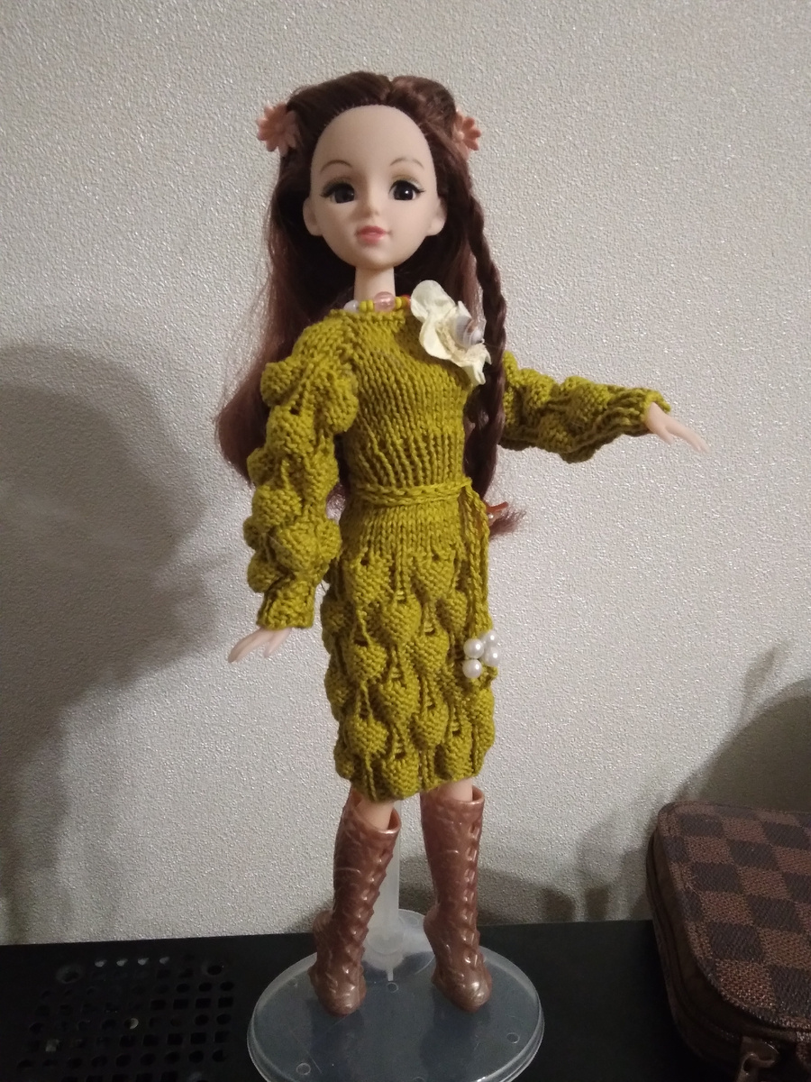 Вывод? Если у вас такая же куколка (28 см), то смело берите это описание и вяжите для нее такое платьишко. Если только рукавок сделать покороче. Для Барби шесть Малинок в высоту, а для Анечки я бы 5 связала. В общем, смотрите сами. Примеряйте и не забывайте ручки куклы обертывать пленкой - и ручки сохраните, и в изделии не запланированных дырочек не появится).