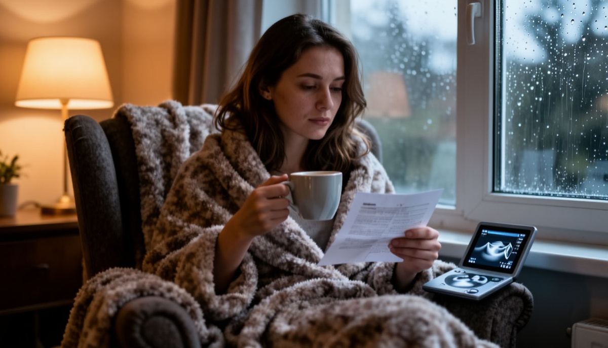 Алёна сидела у окна, в пледе, с чашкой в руках. Чай давно остыл. Она не пила. Просто держала, чтобы чувствовать тепло. В кармане её халата лежал маленький лист бумаги — ультразвуковое исследование. Первый снимок. На нём — тёмное пятно с едва уловимым контуром. Почти ничего. Но для неё — всё.