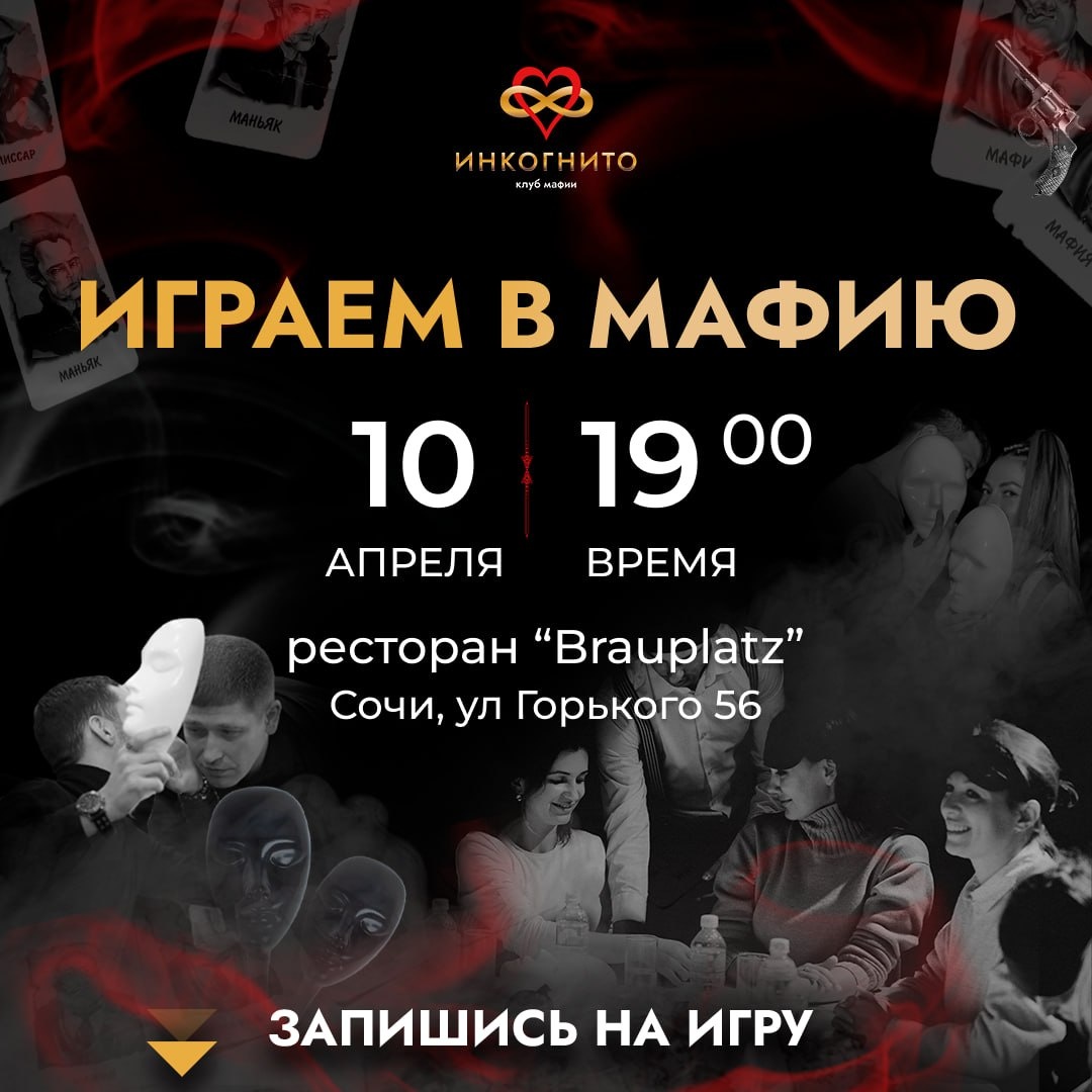 ! Клуб мафии «Инкогнито» приглашает тебя на вечер, где будет всё: азарт, эмоции, новые знакомства! 🥳 🔫 Сначала — играем в МАФИЮ! 💃🏻 Потом — вместе на танцпол! 🎭 Научим играть любого всего за 7 минут — даже если ты ни разу не пробовал! Играем большой, весёлой и громкой компанией 🔥 📆 Пятница, 10 апреля ⏰ 19:00 — сбор и мини-инструкция для новичков 🕢 19:30–23:00 — играем по-крупному 📍 "Brauplatz" — Сочи, ул. Горького, 56 💰 Стоимость — 1500₽, Вдвоём — 2500₽ 📲 Хочешь с нами? Пиши прямо сейчас 👉 @incognitoadmn Места улетают быстрее, чем мафия на голосовании 👀 Клуб интеллектуальных игр "Инкогнито" Сочи