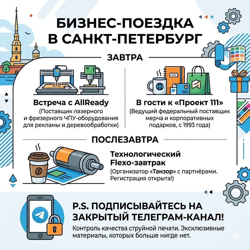Завтра еду в Санкт-Петербург — там запланированы как минимум две встречи в четверг. Первая — с компанией AllReady. Это поставщик лазерного и фрезерного ЧПУ-оборудования для рекламного рынка и деревообработки. Ребята регулярно выставляются на «Рекламе», печатного оборудования не поставляют, но по фрезерным станкам у них есть что посмотреть. После — еду в гости к «Проект 111». Думаю, все, кто работает в мерче, эту компанию знают: крупнейший федеральных игрок рынка мерча. А послезавтра — технологический флексо-завтрак, который проводит «Танзор» с партнёрами. Регистрация ещё открыта, так что, если интересно — можно успеть. P.S. Сейчас активно публикую материалы в закрытый Telegram-канал — про контроль качества струйной печати. Говорю о вещах, которые нигде не рассказываю. Заходите и подписывайтесь. Подписаться на платный Телеграм канал «Сергей Белокуров | Закрытый канал для печатников» - тут https://web.tribute.tg/s/RLQ