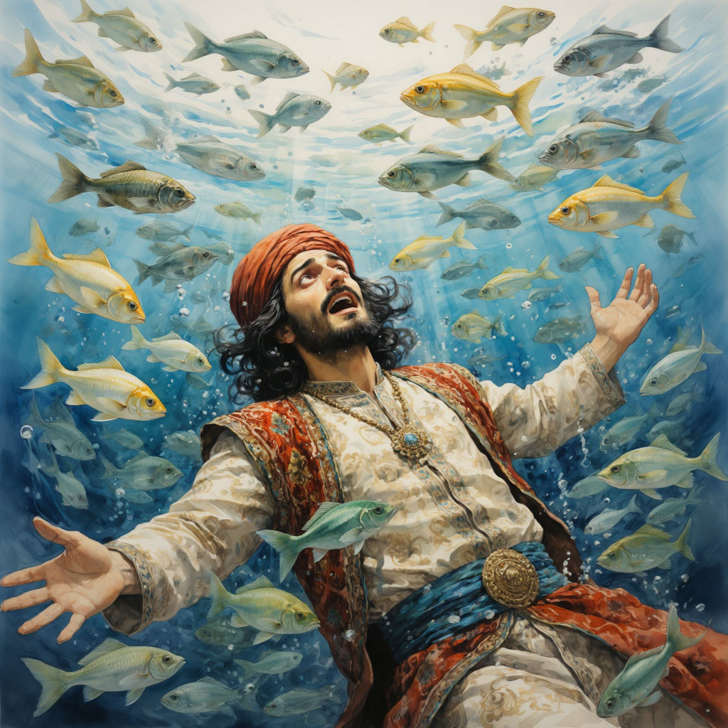 — Меня арестовали, потому что жена заплатила фальшивыми золотыми монетами, и я не понимаю, что произошло. Я взял монеты из коробочки, как обычно, но на этот раз что-то пошло не так, — объяснил Бехруз, всё ещё ошарашенный происшествием. — Я умер? Утонул? — заволновался он, осознав, что находится глубоко под водой.