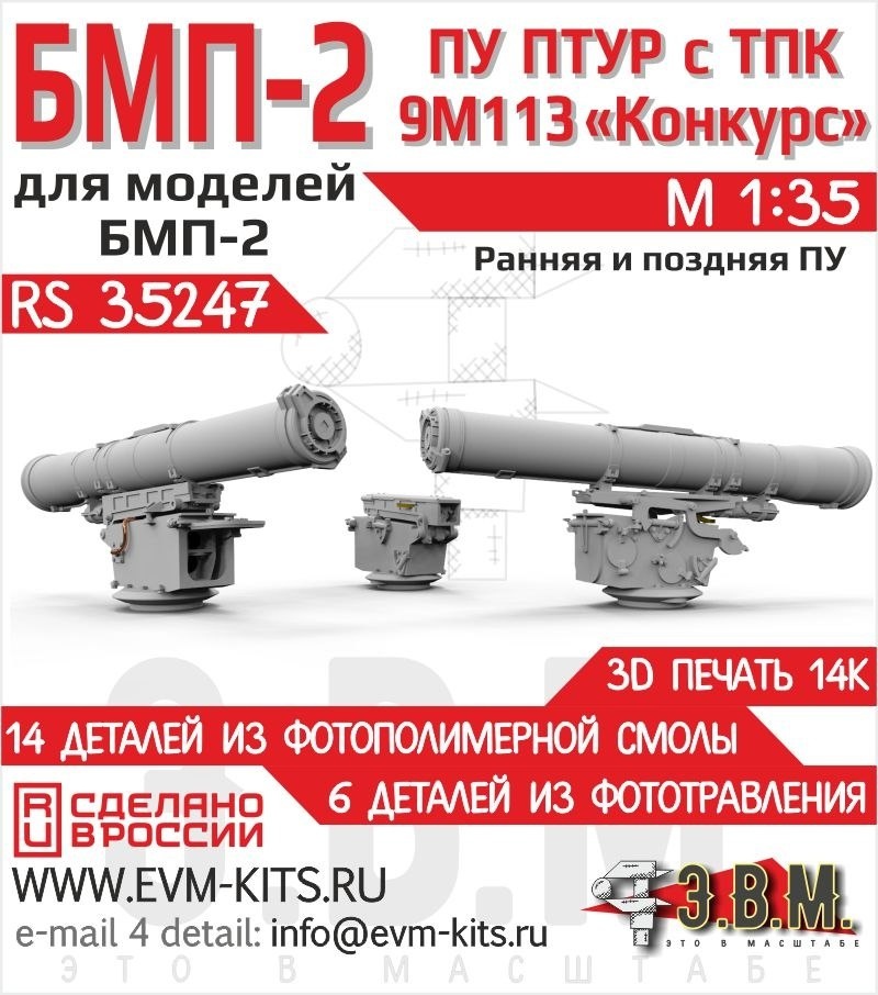 В.М. выпустила на 3D-принтере ПУ ПТУР с ТПК 9М113 "Конкурс" для моделей БМП-2 в масштабе 1/35. В наборе 5 вариантов исполнения и 3 версии ПУ: ранняя, поздняя, поздняя без ТПК с защитной крышкой направляющей: БМП-2 ПУ ПТУР с ТПК 9М113 "Конкурс" (каталожный номер RS35247)