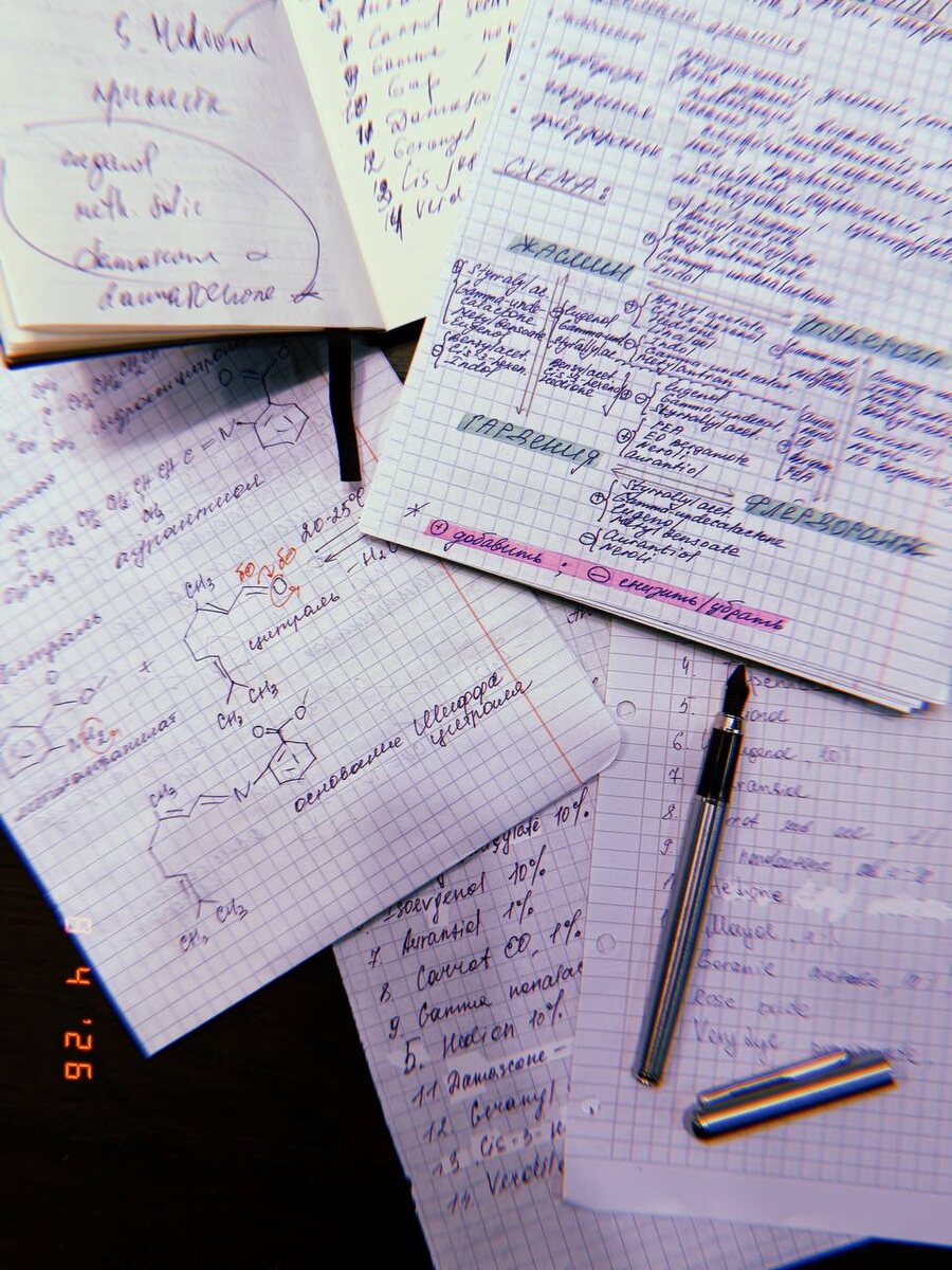 ! Так забавно, помню, как в детстве играл в учителя, а теперь реально сижу с листочками студентов… Домашка была двойная — написать реакцию образования оснований Шиффа, которые используются в индустрии. Во второй части надо было нарисовать схему перехода от одного цветка к другому — например, чтобы получить аккорд туберозы из жасмина, можно добавить альдегид С18 и метилсалицилат.