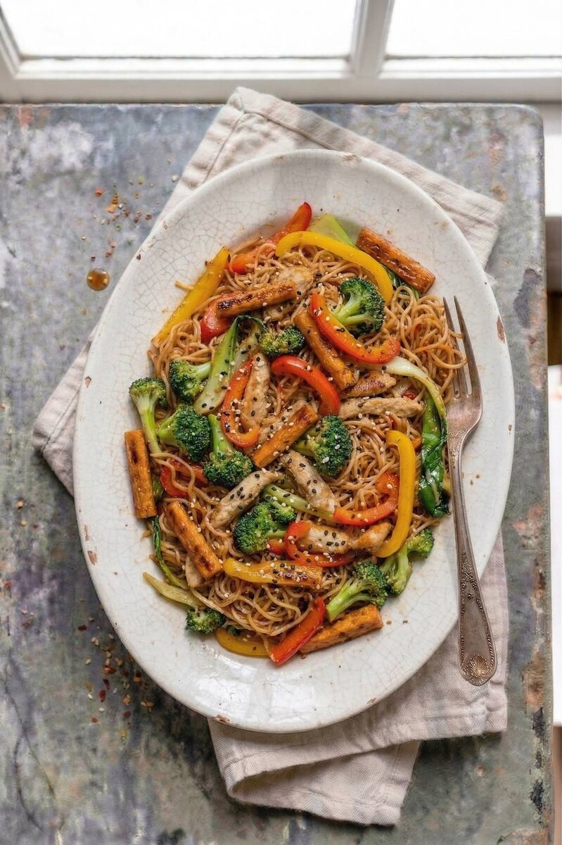 Что‑то мы с вами засиделись на макаронах да кексах - пора тряхнуть стариной и приготовить что-то азитаское! Чоу‑мейн с курицей - это классическое китайское блюдо из лапши, которое даже тот, кто от плиты обычно бежит как от дракона, приготовит без пота и слёз. Если я пишу, что готовить просто, то так оно и есть. Понятно, что азиатские ингредиенты не у всех есть под рукой, но тут из экзотики - только пак чой, но и без него можно вполне обойтись. Ингредиенты: 450 г любой азиатской лапши; 2 ст. л. Растительного масла; 2 небольшие луковицы, мелко нарезанные; 2 средние моркови, нарезанные бруском; 2 средних красных болгарских перца,тонко нарезанных; 2 маленьких кочана бок‑чоя, нарезанных (если есть); 300 г соцветий брокколи; 300 г варёной или запеченной куриной грудки,нарезанной полосками длиной 5 см; 1 ч. л. свежего имбиря, натёртого; 4 ст. л. соевого соуса; 1 ст. л. рисового уксуса; 2 ч. л. кунжутного масла; 1 ч. л. молотого чёрного перца (или по вкусу); белые и черные семена кунжута (по ж