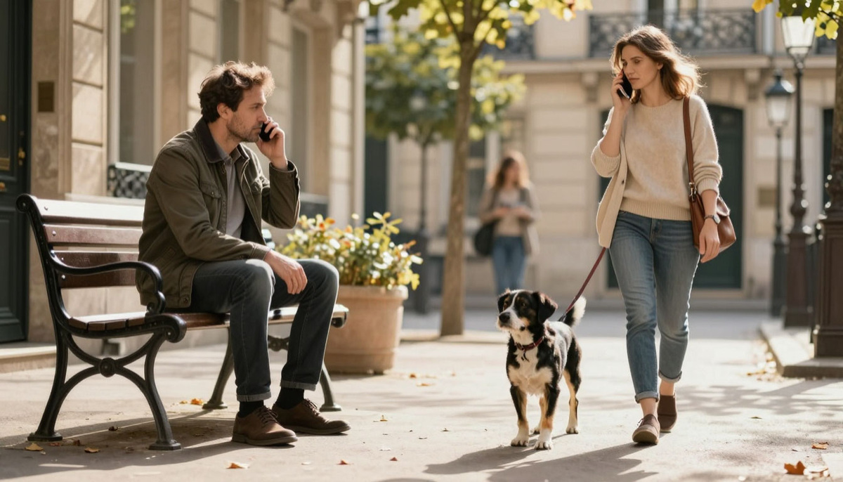 Он подходит к её дому — она как раз выходит с собакой.
