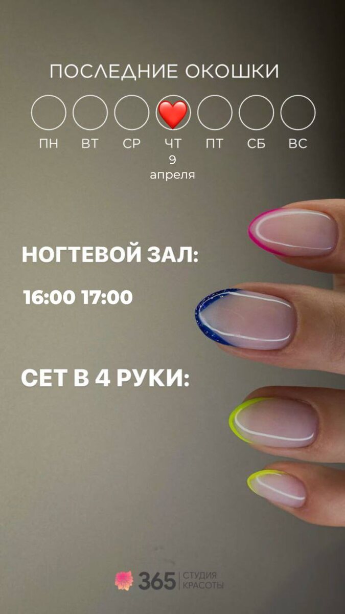 ❤ ЧТО МОЖНО УСПЕТЬ СДЕЛАТЬ 9 апреля 2026 года : Ногтевой зал: 16:00 17:00 Оформление бровей и ресниц: 10:00 13:30 15:00 16:00 Парикмахерский зал: 13:00 ЗАПИСАТЬСЯ МОЖНО ЛЮБЫМ УДОБНЫМ СПОСОБОМ: 👉🏻 Сообщение в Whats'app https://wa.me/79663654477 👉🏻По телефону +79663654477 👉🏻Онлайн запись https://n286444.yclients.com/ #команда365 #красота #наслаждение #забота #весна #апрель #любовь #мечтысбываются #радость #возможность