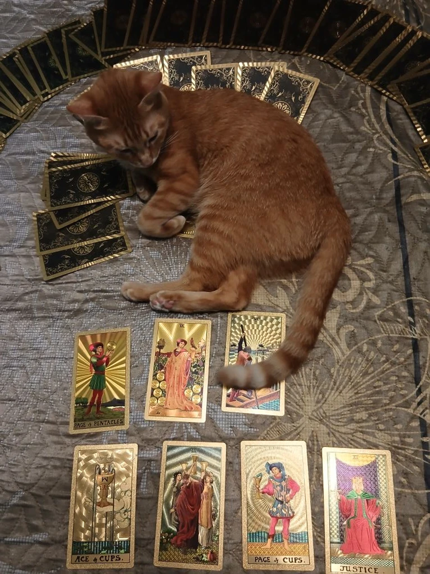 Привет, мои блестящие котята и охотники за золотом! 👋😻 Я Тося — первая гадалка Дзена, сегодня устроила королевский ритуал! Растянулась во весь рост на титульной карте золотой колоды Таро Уэйта — той самой, где мальчик выпускает из рук птицу! 🕊️✨ Это символ освобождения, новых начал, полёта души — идеальная подушка для кошачьей магии! Мурлыкала, гладила карты пузиком, носиком вынюхивала энергии... и лапки потянули 7 КАРТ: Паж Пентаклей, 9 Пентаклей, 6 Мечей, 3 Кубков, Туз Кубков, Паж Чаш, Справедливость! Это эпичная сага от первых монет до космической гармонии. Лежа, я активировала магию — сбывается при чтении! Муррр, держитесь за усы! ⚡🌟