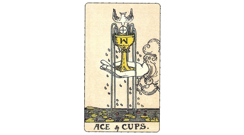 Туз Кубков – это полная чаша, карта удовольствия, чистого восторга и эйфории. Близкая ей по смыслу – Девятка Кубков. Но Девятка Кубков больше связана с физическими, плотскими удовольствиями. А Туз Кубков – это экзальтация, наивысшая точка блаженства. Туз Кубков – это «вау-вау!». Само изображение на карте явно говорит о водной природе аркана и масти в целом. Водная – значит, эмоциональная. Эмоции по этой карте переполняют, льются через край. И это явно позитивные, радостные эмоции, сам сюжет карты, цветовая гамма ее об этом говорят. Голубь, несущий в клюве гостию (в православии это просфора называется) указывает на благие намерения и одухотворенность. Рука, появляющаяся ниоткуда, из облаков, протягивает полный кубок, вероятно, с нектаром «на, возьми!». Это возможность, шанс. Все Тузы – это шанс. Туз Кубков – это Святой Грааль. Неожиданная радость и возможность напиться, наполниться счастьем. 1) Восторг, эйфория, экстаз, воодушевление, радость 2) Вдохновение 3) Удовольствие, наслаждаться
