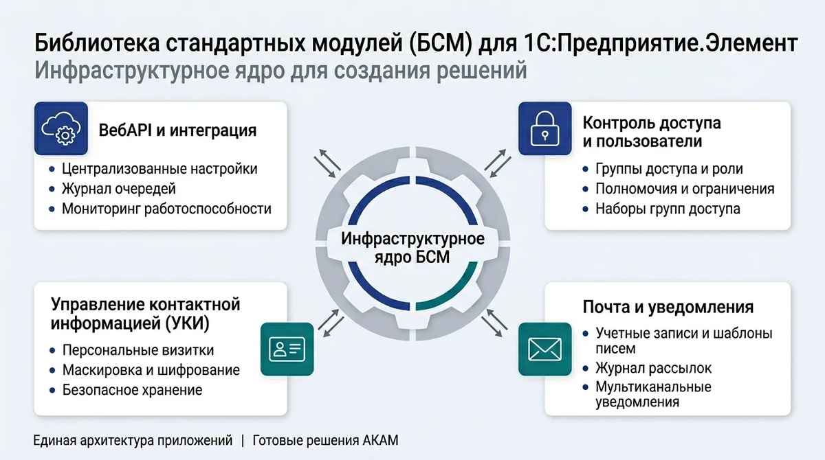 Представьте, что нужно построить дом. Можно самому добывать глину и рубить лес. Это долго и трудно. А можно взять готовые материалы и заняться планировкой и дизайном. Такой библиотечный подход мы рассмотрим в разработке на технологии «1С:Предприятие.Элемент». В корпоративных приложениях выбор тот же. Когда нужен обмен данными, сложные права доступа или уведомления, велик соблазн написать всё с нуля. «Так будет точнее под наши задачи», думает разработчик. Но этот путь ведёт к уникальным ошибкам, усложнению поддержки и росту стоимости проекта. Альтернатива есть. Библиотечный подход позволяет собирать приложение из готовых промышленных компонентов. Разберём, что это даёт и какие подсистемы станут фундаментом. Что такое библиотечный подход Библиотеки — это набор готовых механизмов. Вы можете подключать чужие или создавать свои. Это ускоряет старт новых проектов. Главные плюсы: Как это работает на практике За каждым преимуществом стоит экономия времени. Вы избегаете ситуации, когда один баг