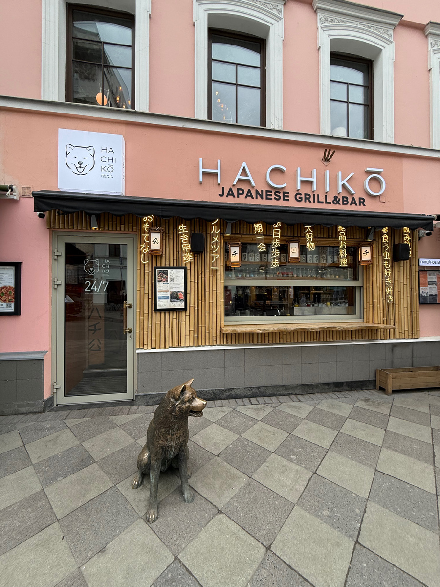Японский гриль-бар «Хатико», который мы, кстати, очень любим и часто туда заходим, и собачку у входа погладить и вкусно перекусить (бар работает круглосуточно и это очень удобно).