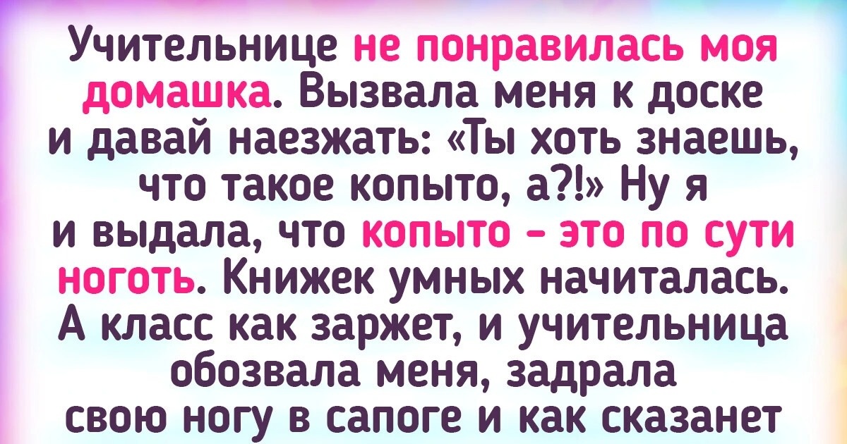 Нет такого человека, который был бы экспертом во всех областях науки. Но чужая безграмотность порой вводит в ступор, и герои нашей подборки попытались отстоять свою правоту. А в бонусе мы поведаем о том, что даже врожденная грамотность может временно покинуть своего хозяина. 2-й класс. Учительница вызвала меня к доске (уж не знаю, что ей в моем домашнем задании не понравилось) и давай наезжать: «Ты хоть знаешь, что такое копыто, а?!» А я, начитавшись всяких книжек о животных, ответила, что копыто — это в своем роде ноготь. Все в классе почему-то заржали, а учительница обозвала меня мерзкими словами, задрала свою ногу в сапоге, постучала рукой по подошве и дала мне «единственно верный» ответ: «Копыто — это ступня!» © LesFox / Pikabu До сих пор помню, как в 4-м классе толпа одноклассниц ржала надо мной, когда я сказала, что человек — млекопитающее. Их аргумент заключался в том, что «а вот у меня есть подружка, у которой аллергия на молоко». © vietturtle / Pikabu На биологии проходим живо