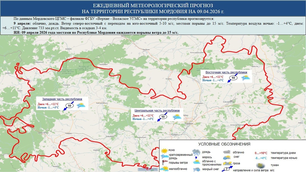 ☁️⛅⛈️ 9 апреля в Мордовии облачно, дождь с видимостью в осадках 3-4 км