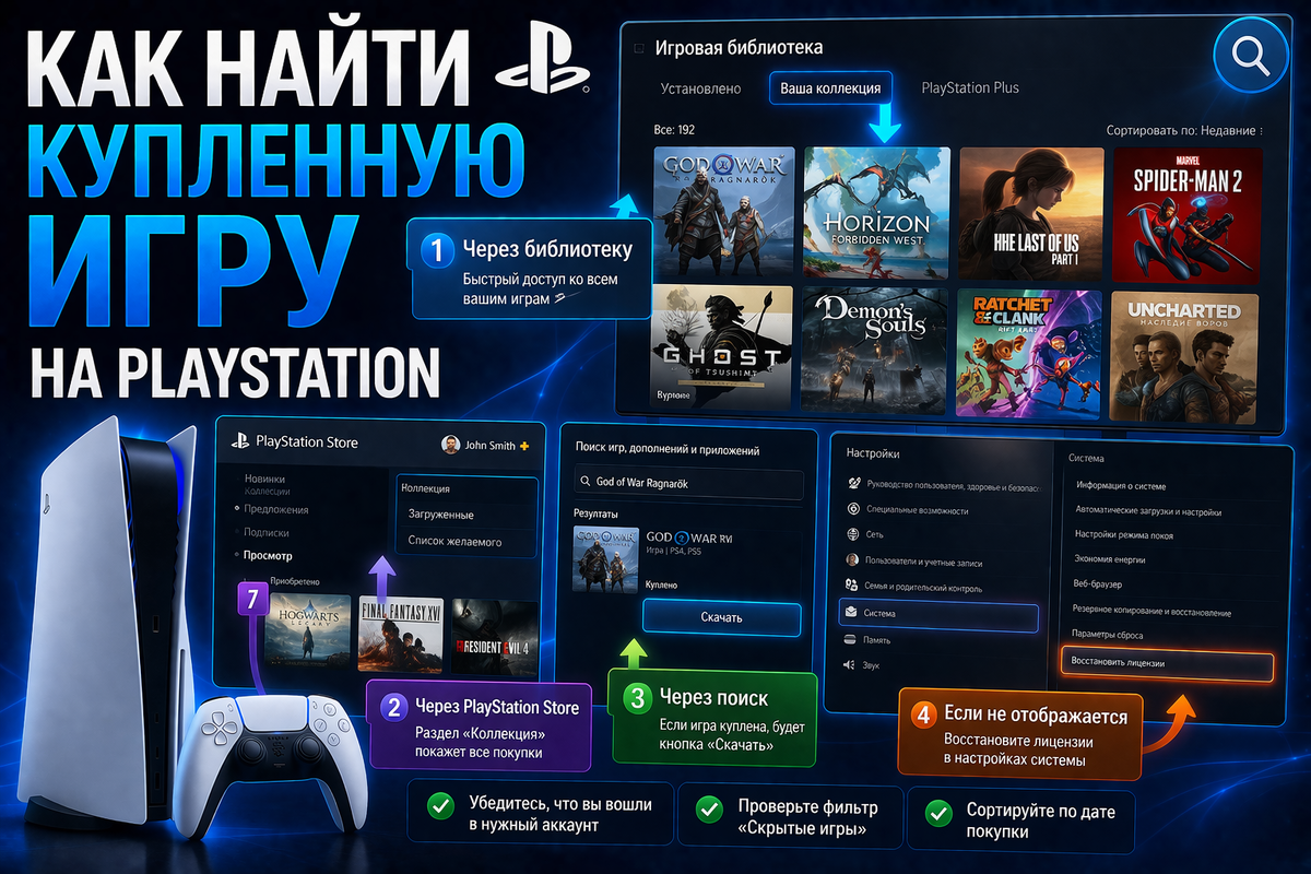 Кратко: Купленные игры хранятся в «Библиотеке» на PS5 — значок книги на главном экране. Там же раздачи PS Plus и игры из каталога Extra. Если игры нет в библиотеке — проверьте, на том ли аккаунте вы вошли. Видеоинструкция: смотрите наше видео (0:50). Где искать купленные игры на PS5 1. На главном экране PS5 перейдите в «Библиотека» (значок книги справа) 2. Выберите «Ваша коллекция» 3. Здесь все ваши игры — купленные, полученные по PS Plus, из каталога Игры можно отсортировать: • По дате покупки (новые сверху) • По алфавиту • Только PS5 или PS4 игры • Только установленные или все Игра не отображается в библиотеке Частая ситуация после покупки через наш магазин. Причины: Вы вошли не в тот аккаунт. Игра привязана к аккаунту, на который её купили. Если у вас два аккаунта (основной + региональный) — переключитесь на региональный и проверьте его библиотеку. Игра ещё не куплена. Если оформляли заказ — уточните у нас в Telegram статус. Игра из каталога PS Plus. Если подписка истекла — игры из