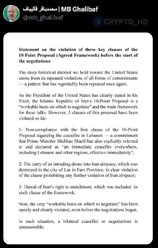 🇮🇷 Спикер парламента Ирана заявил, что в текущих условиях проведение переговоров и даже обсуждение двустороннего прекращения огня между США и Ираном не имеет смысла. Глубокое историческое недоверие, которое мы испытываем к США, проистекает из их неоднократных нарушений всех форм обязательств – к сожалению, эта модель повторяется вновь. Как ясно заявил президент США, 10-пунктное предложение Исламской Республики Иран является "рабочей основой для переговоров" и главным рамочным документом для этих обсуждений. Однако на данный момент уже нарушены три положения этого предложения. ➠ Во-первых, не соблюден первый пункт, касающийся прекращения огня в Ливане – обязательства, которое премьер-министр Шахбаз Шариф также прямо подтвердил как "немедленное прекращение огня повсюду, включая Ливан и другие регионы". ➠ Во-вторых, имело место вторжение беспилотника в воздушное пространство Ирана, который был уничтожен в городе Лар в провинции Фарс, что является явным нарушением положения, запрещаю
