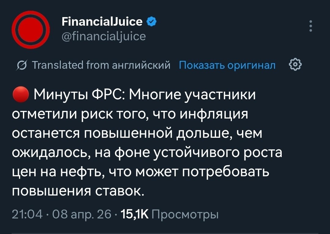 ? Тогда были тарифные войны и цикл глобального смягчения Сейчас цикл ужесточения из-за реальных войн и шока на энергорынках и других Ущерб уже нанесён — Job Well Done «Протокол заседания ФРС показал, что "подавляющее большинство" чиновников считают, что прогресс в отношении темпов роста инфляции может быть медленнее, чем ожидалось, что обусловлено тремя взаимосвязанными причинами Влиянием тарифов на цены на товары, для снижения которого может потребоваться больше времени, ростом цен на нефть, влияющим на базовую инфляцию, и риском того, что годы превышения целевого уровня инфляции сделали ожидания более уязвимыми к очередному потрясению» @marketheart