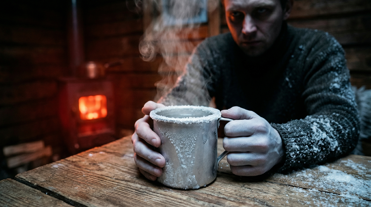 Как только дыхание Макса коснулось кружки, восходящий пар мгновенно исчез. Жидкость издала тихий, сухой треск. Пар не сдуло — он кристаллизовался прямо в воздухе. На краях раскаленной алюминиевой кружки за секунду образовалась плотная белая кромка льда.