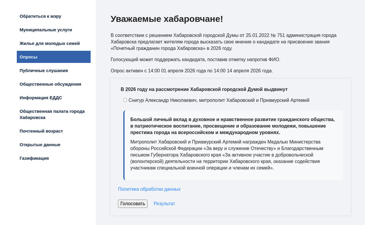 Традиционно перед Днем города началась процедура выбора почетного гражданина Хабаровска. В этом году на сайте мэрии в разделе «Опросы» появился единственный кандидат. Это митрополит Хабаровский и Приамурский Артемий (Александр Николаевич Снигур). - Большой личный вклад в духовное и нравственное развитие гражданского общества, в патриотическое воспитание, просвещение и образование молодежи, повышение престижа города на всероссийском и международном уровнях, - так описываются заслуги кандидата перед Хабаровском. После завершения опроса решение о присвоении почетного звания примет городская дума. Отметим, что в последний раз единственный кандидат в почетные граждане выдвигался в 2021 году. Это была главврач «Вивеи» Наталья Болоняева. Интересно, что тогда большинство респондентов в ходе опроса на сайте мэрии проголосовали против нее, но решением гордумы она все равно получила звание. Сейчас эта история точно не повторится, потому что кнопки «против» в таких голосовалках больше нет. Справка