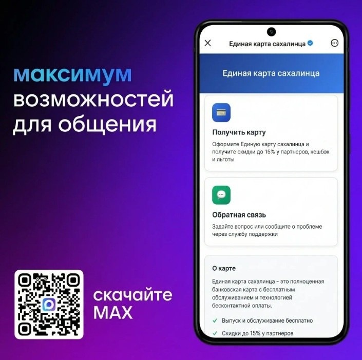 » Главное преимущество приложения – глубокая интеграция с государственными сервисами региона. В «Мах» уже работают чат-боты, которые экономят время, избавляя от личных походов в ведомства. Один из таких ботов – «Единая карта сахалинца». Он предоставляет всю ключевую информацию: • о возможностях карты • порядке оформления • актуальном списке партнёров Ссылка на бот: https://clck.ru/3Szdn2 Проект реализуется в рамках нацпроекта «Экономика данных», инициированного Президентом России Владимиром Путиным.