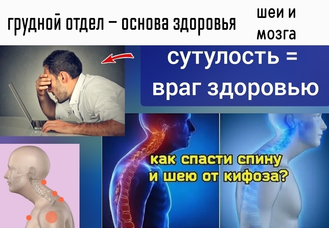 А вот если грудной отдел закрепощен (например, застыл в сутулом, слишком округленном положении) - тогда возникают проблемы со всеми отделами позвоночника. В том числе с шеей: ведь из-за сутулости шея вынуждена выпячиваться вперёд. И тогда перенапрягаются крохотные, но очень важные подзатылочные мышцы. Их спазм давит на позвоночные артерии, через которые кровь течет в голову, кровоснабжая мозг.