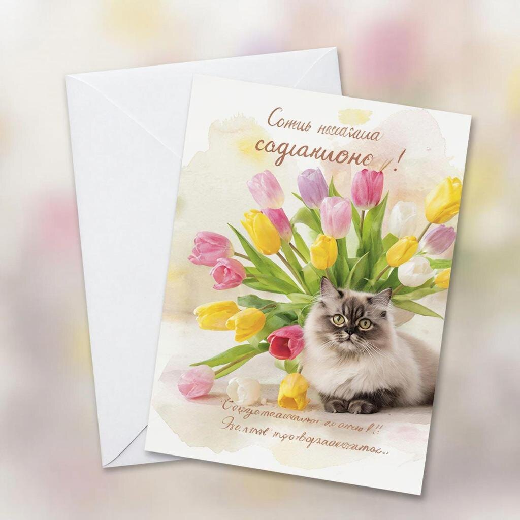 · Задача: открытка «С 8 Марта» с букетом тюльпанов и котом