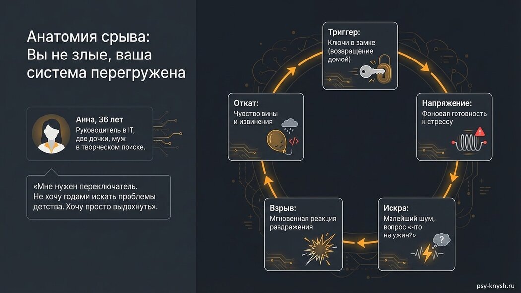 «Доктор, я прихожу с работы, ключи в замке - и уже напряжена. Малейший шум, неубранная игрушка, вопрос "что на ужин?" - и я взрываюсь. Потом чувствую вину, извиняюсь, а к вечеру снова на взводе. Я не злая. Я просто как оголённый провод, всегда под напряжением».