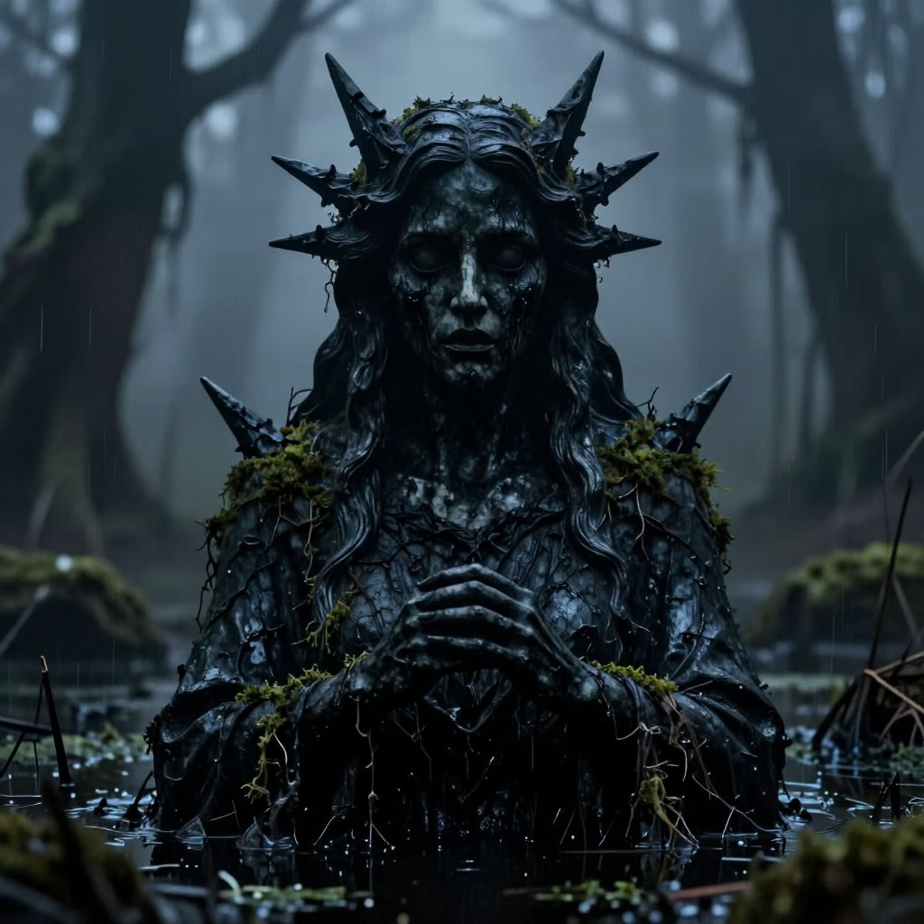 Там, где раньше была чёрная жижа и кочки, теперь стояла фигура. Высокая, чёрная, блестящая, как обсидиан. В ней угадывались черты женщины — руки, сложенные на груди, длинные волосы, сросшиеся с телом, глаза, закрытые веками, которые никогда не откроются.