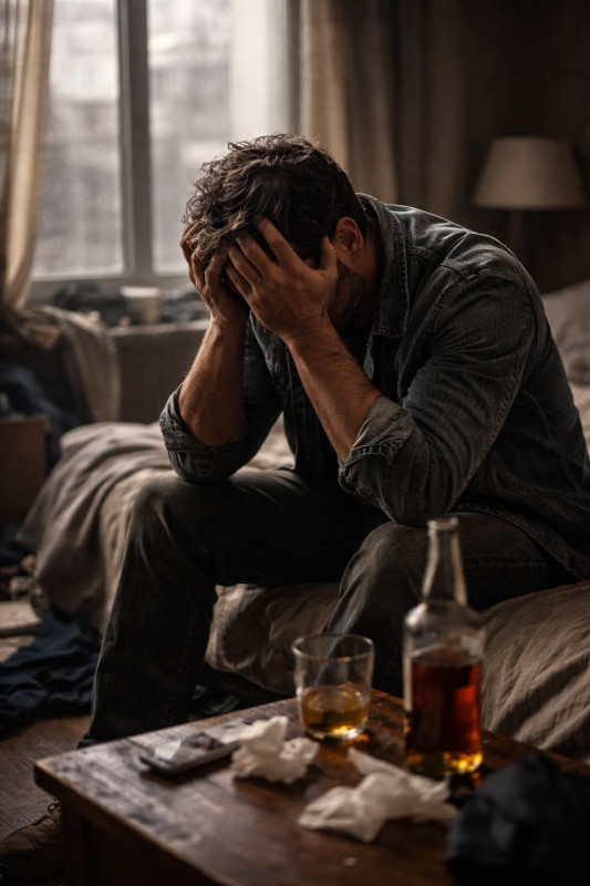 Я сползаю через низ с разложенного дивана, и каждое движение отдает мышечной болью и зашкаливающим давлением в голове и всему телу. Я буквально чувствую свое бурлящее артериальное давление. Поднявшись на ноги я отправляюсь в зону турбулентности. Покачиваясь не физически, но психологически я выбираю маршрут одновременно с стартом автопилота. Мой взгляд опознал недопитый стакан с темной жидкостью. Я понимаю что это скорее всего теплая кола с виски, возможно в очень жестокой дозировке. Это точно ближе фильтра с водой который находится на кухне. Да будет так. Я хватаю бокал и осушаю его до дна. Алкоголь чувствует себя как дома и мгновенно всасывается в организм латая дыры моего отвратительного самочувствия. Мне мгновенно становится легче внутри и сильно мерзко во рту. Ощущение что сухость и кислость была приправлена теплым алкоголем создают такой коктейль из мерзости, что появляется рвотный позыв. Мужественно сдержавшись, я натянутой улыбкой награждаю особу в кровати, которая с любопытством и интересом разглядывает меня.