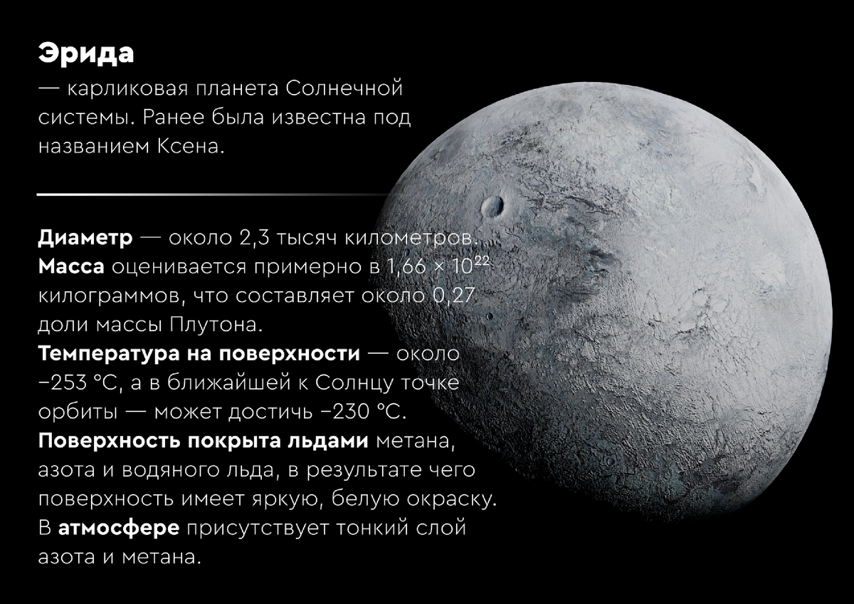 Такая «тяжёлая» начинка намекает на бурное прошлое: скорее всего, Эрида родилась в результате гигантского столкновения на заре Солнечной системы. Удар был такой силы, что она потеряла большую часть летучих веществ, а оставшееся сжалось в плотный шар.