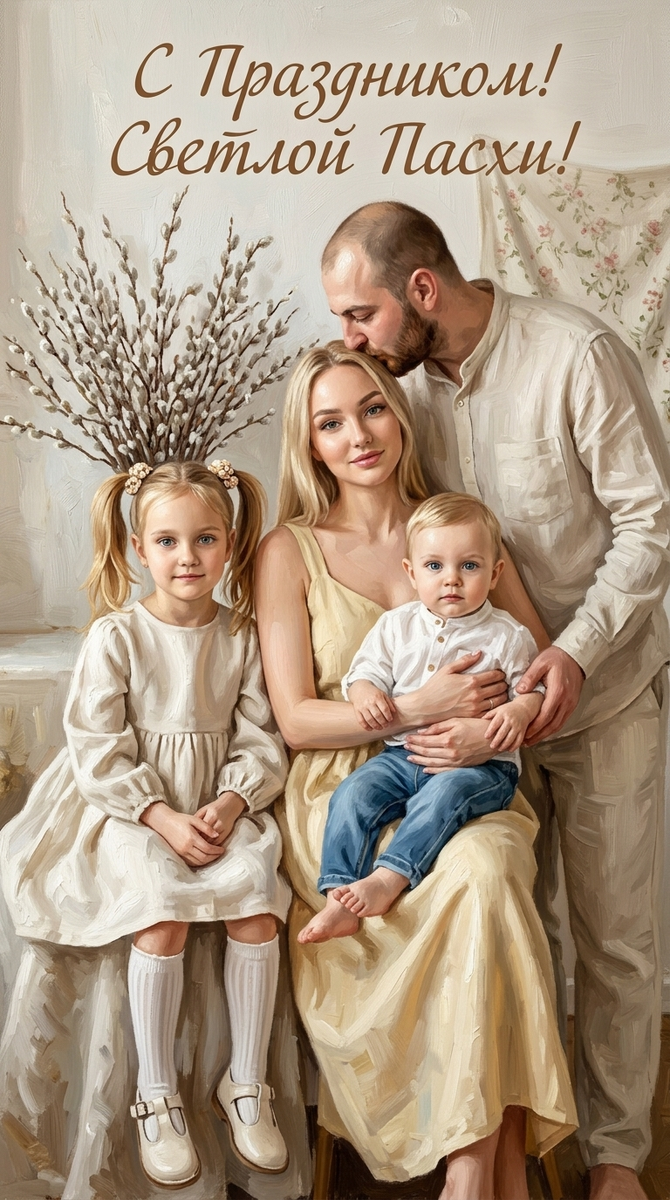 Освещение: мягкое, рассеянное, естественное, подчеркивающее черты лиц и создающее объем на веточках вербы\.