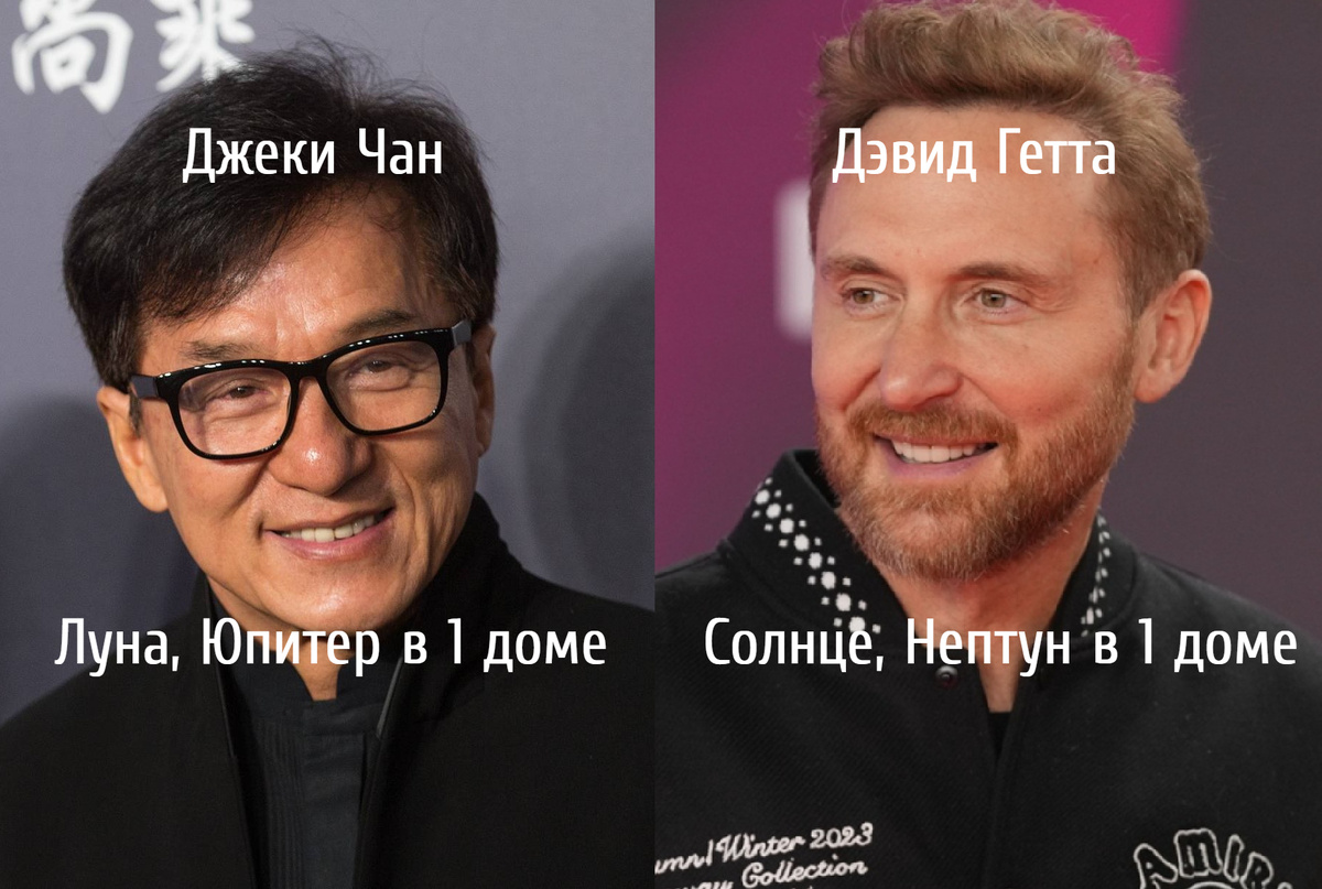 Давайте посмотрим, как работают планеты в 1-м доме на примерах диджея Дэвида Гетта и актера Джеки Чана.