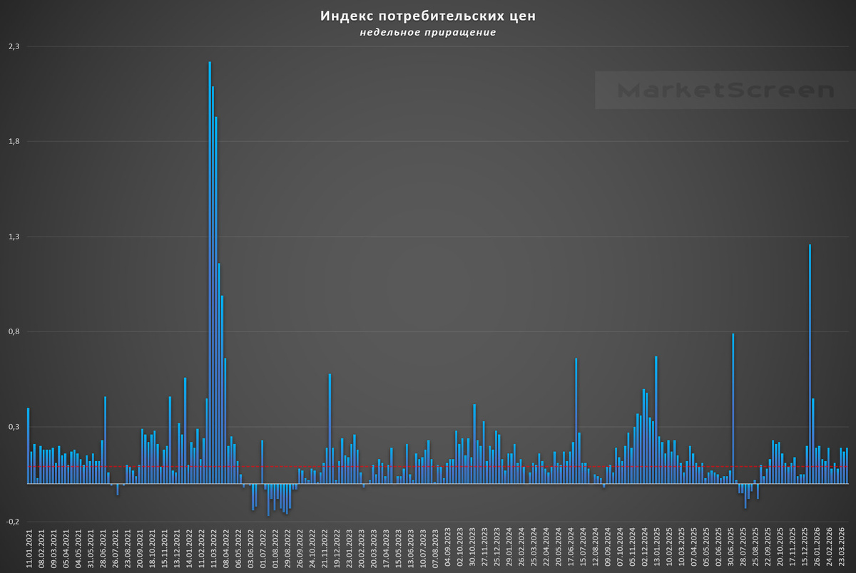 — Дефицит бюджета США ИНФЛЯЦИЯ В РФ С 31 МАРТА ПО 6 АПРЕЛЯ СОСТАВИЛА 0,19% ПОСЛЕ 0,17% С 24 ПО 30 МАРТА - РОССТАТ На продовольственные товары цены выросли на 0,17% (после роста на 0,09% неделей ранее), в том числе на плодоовощную продукцию на 0,18% (после снижения на 0,25%), на остальные продукты питания темпы роста цен составили 0,17% (после роста на 0,12% неделей ранее). В сегменте непродовольственных товаров темпы роста цен умеренные (0,07% после 0,05% неделей ранее), в секторе наблюдаемых услуг - снизились до 0,39% (с 0,51% неделей ранее) Цены на бензин автомобильный и дизельное топливо выросли за неделю на 0,2%. Отмечу, подобные недельные цифры более чем в 2 раза превышают значения, необходимые для выхода на целевой годовой уровень. *** Про дисконт. По данным на 1 апреля 2026 Нашел у еще одного провайдера данных в области энергетических и прочих рынков Incorry