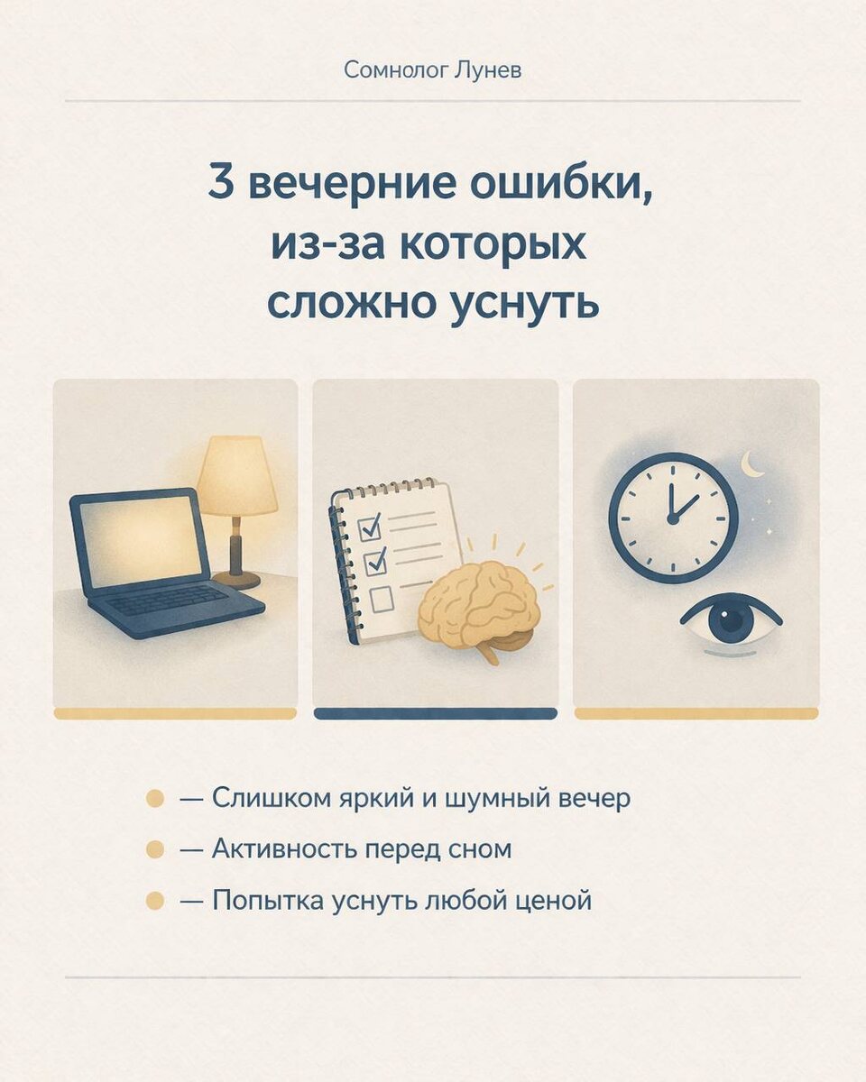 Нет, я не буду сейчас писать, что телефон — абсолютное зло, а спасение только в свечке, бумажной книге и звуках монастырского колокола. Но есть действительно частые вечерние привычки, после которых мозгу трудно понять, что день закончился. 1. Слишком яркий и слишком шумный вечер. Яркий свет, бесконечные видео, переписки, новости, эмоциональные качели — всё это мозг считывает как продолжение дня. Он еще не понял, что пора снижать обороты, а вы уже хотите от него немедленного сна. 2. Поздняя активизация жизни. Некоторые люди к 22:00 внезапно вспоминают, что именно сейчас идеально: убраться, разобрать документы, начать новый проект, обсудить отношения или посмотреть важное интервью на два часа. Организм, конечно, в восторге. 3. Попытка уснуть «любой ценой». Когда человек ложится с мыслью: «Так. Срочно спать. Немедленно. Завтра важный день». После этого включается внутренний надзиратель, который каждые пять минут проверяет, заснули ли вы. Как вы понимаете, с такой охраной уснуть сложно