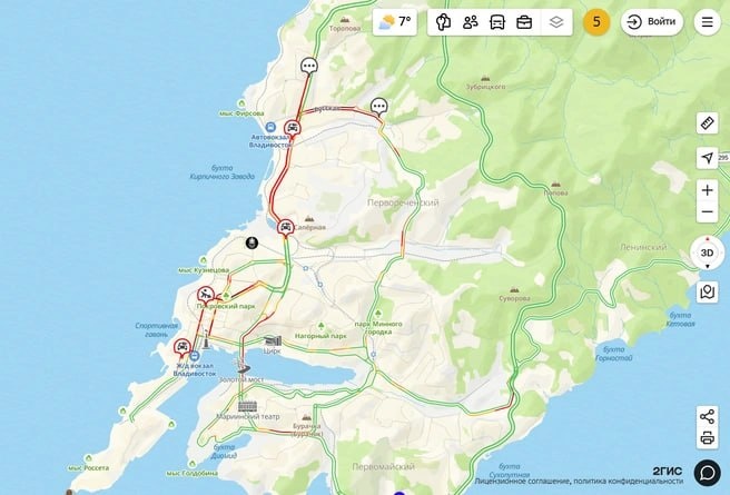 Горожане пишут в соцсетях, что ДТП произошло на въезде на въезде в микрорайон — на перекрёстке Бестужева и Захарова. На фотографии, взятой из 2ГИС, видно, что один из автомобилей получил значительные повреждения передней части. На дороге лежат обломки, что привело к частичному перекрытию движения. Подробности происшествия пока не обнародованы. В результате ДТП сразу несколько улиц города оказались в темно-бордовой зоне, что означает очень большой затор и невозможность проезда. Полностью заблокирована дорога в сторону Маяка, огромная пробка тянется с центральной площади. Почти нет движения на улицах Алеутской, Октябрьской, Партизанском и Океанском проспекте. Затруднен проезд на улицах 1-я Морская, Семеновская, Пограничная и Светланская. Относительно спокойно на Тигровой. На момент публикации на Эгершельде пробка заканчивалась в районе дома № 20 на улице Бестужева. Путь из центра города нормализовывался после кольца Красного Знамени. Кроме того, из-за ДТП на улице Русской колом вста