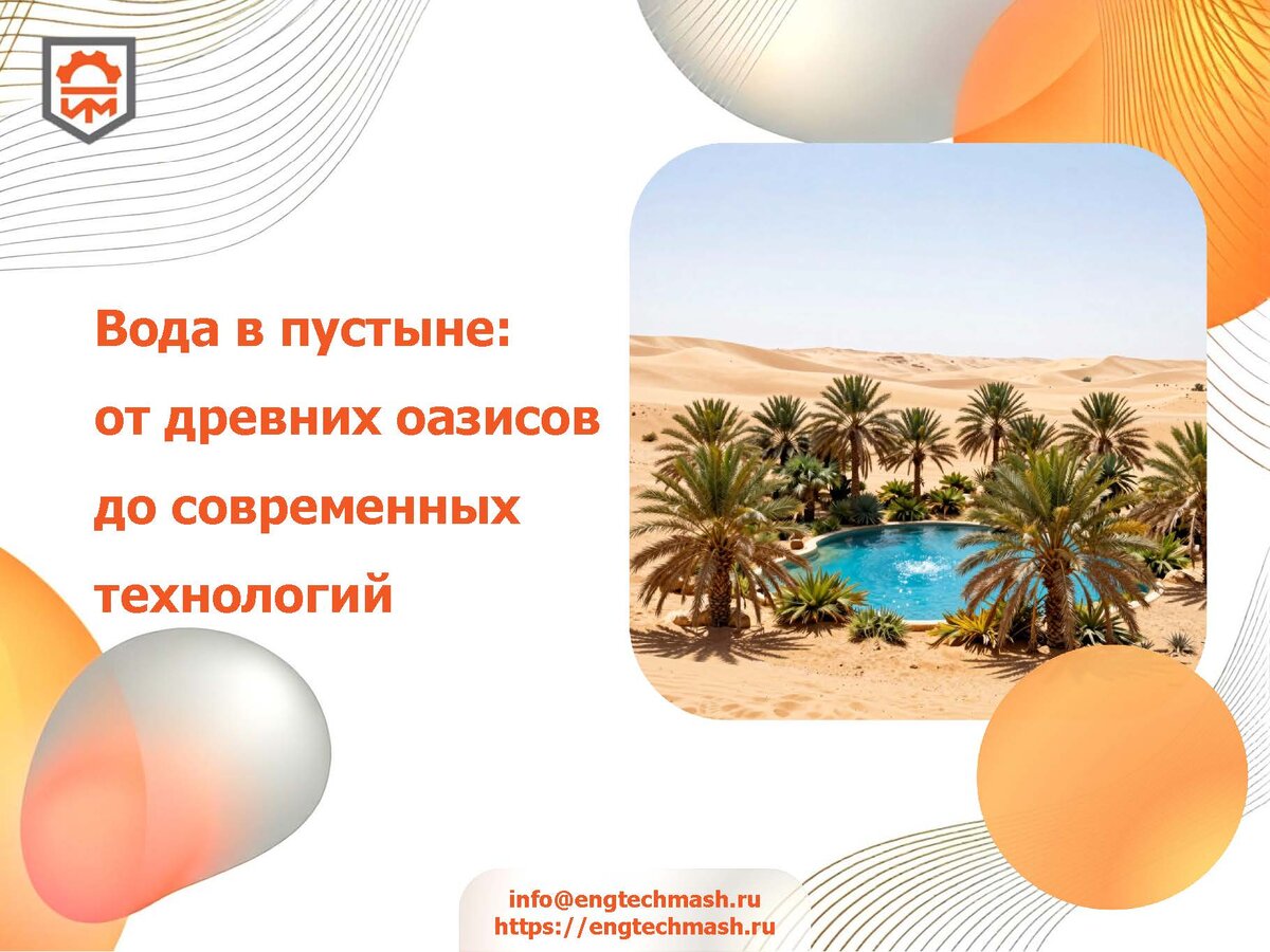 Жизнь в пустыне — это ежедневная борьба за воду. При температурах, достигающих +50 °C, дожди становятся редкостью, а путешествия по пескам могут быть опасны. В таких условиях вода становится самой ценной находкой, а оазисы — настоящими островами спасения для людей и животных. Оазисы — дар природы Люди научились обходиться с нехваткой воды еще задолго до появления современных технологий, полагаясь на природные водные источники – оазисы. Они образуются благодаря подземным водам, которые располагаются близко к поверхности. Водонепроницаемые слои почвы удерживают воду, предотвращая её уход. К оазисам постепенно стекаются птицы и животные, принося с собой семена, и так маленький участок превращается в зелёный уголок жизни. С течением веков оазисы сыграли важную роль в истории: они служили местами остановки для караванов и торговых путей; становились центрами поселений и даже аренами политических конфликтов. Наскальные рисунки и артефакты, найденные в оазисах, свидетельствуют о том, что они