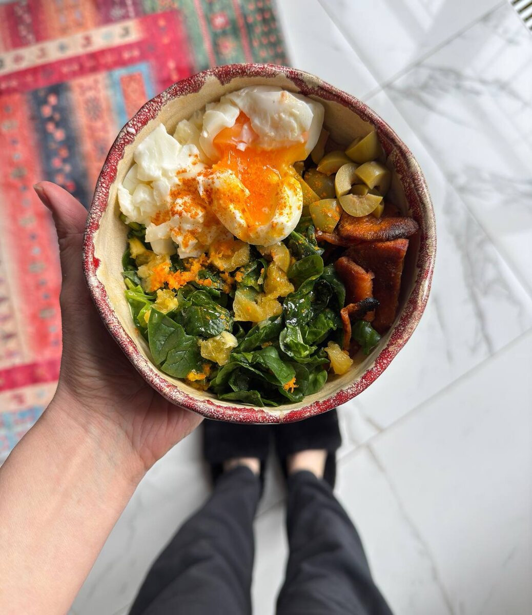 Что в тарелке: • Белок: три яичных белка • Долгий углевовд: запеченный батат с паприкой • Жиры: яичный желток одна штука, оливки и 2 ч.л масла оливкового в салате • Клетчатка: шпинат, батат Еще тут долька апельсина и лимонного сока. Боул перед употреблением обязательно перемешиваем, чтобы все ингредиенты равномерно пропитались маслами и соками – никогда не надо жевать сухие листья салата или той же курицы, если вы ее сюда добавите вместо яиц: еда должна быть вкусной, сочной, аппетитной Про желтки часто спрашивают: зачем их вообще убирать и куда девать лишние? Отвечаю: • убирать для баланса, чтобы не было избытка жиров в рамках суточного потребления – мне скучно было бы съесть три яйца, тк тогда уже бы пришлось обойтись без оливок и масла, а это дает меньше разнообразия по вкусу и микроэлементам • на остальных желтках можно сделать домашний соус для заправки еще одного салата или добавить их в выпечку Вот здесь делала для вас целую подборку зож-завтраков с рецептами, там даже буте
