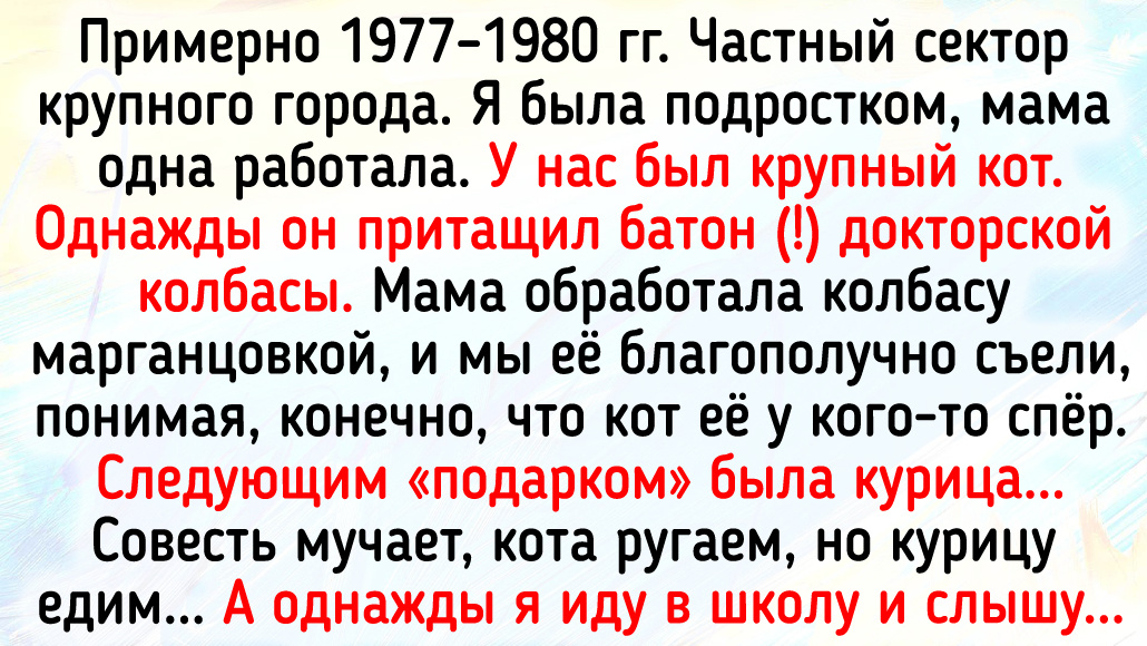 Время действия — примерно 1977–1980 гг. Частный сектор крупного города. Я была в подростковом возрасте, мама одна работала. У нас был крупный кот. Однажды кот притащил батон (!) докторской колбасы. Мама обработала колбасу марганцовкой, и мы её благополучно съели, понимая, конечно, что кот её у кого-то спер.