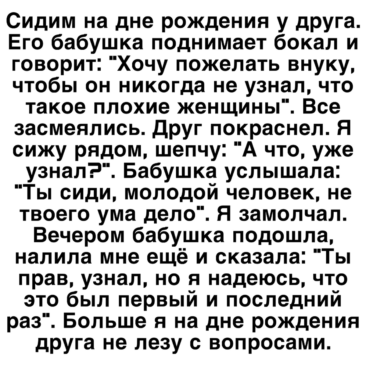 Сидим на дне рождения у друга. Его бабушка поднимает бокал и говорит: "Хочу пожелать внуку, чтобы он никогда не узнал, что такое плохие женщины". Все засмеялись. Друг покраснел. Я сижу рядом, шепчу: "А что, уже узнал?". Бабушка услышала: "Ты сиди, молодой человек, не твоего ума дело". Я замолчал. Вечером бабушка подошла, налила мне ещё и сказала: "Ты прав, узнал, но я надеюсь, что это был первый и последний раз". Больше я на дне рождения друга не лезу с вопросами.