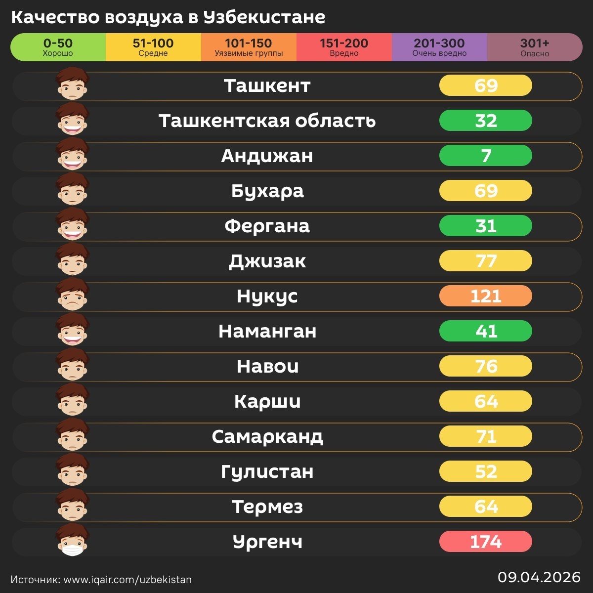 Также чистый воздух с утра в Ташкентской области, Фергане и Намангане.
