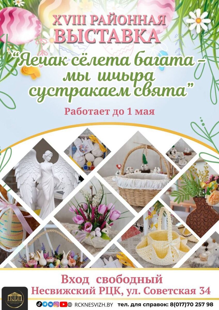 : 🌸 «Яечак сёлета багата — мы шчыра сустракаем свята» 👉 Это прекрасная возможность увидеть уникальные пасхальные работы: ✔️ плетёные корзины; ✔️ декор из соломки и бисера; ✔️ глиняные ангелочки и многое другое. Несвижский РЦК (г. Несвиж, ул. Советская, д. 34). Выставка будет работать до 1 мая. Вход — свободный.