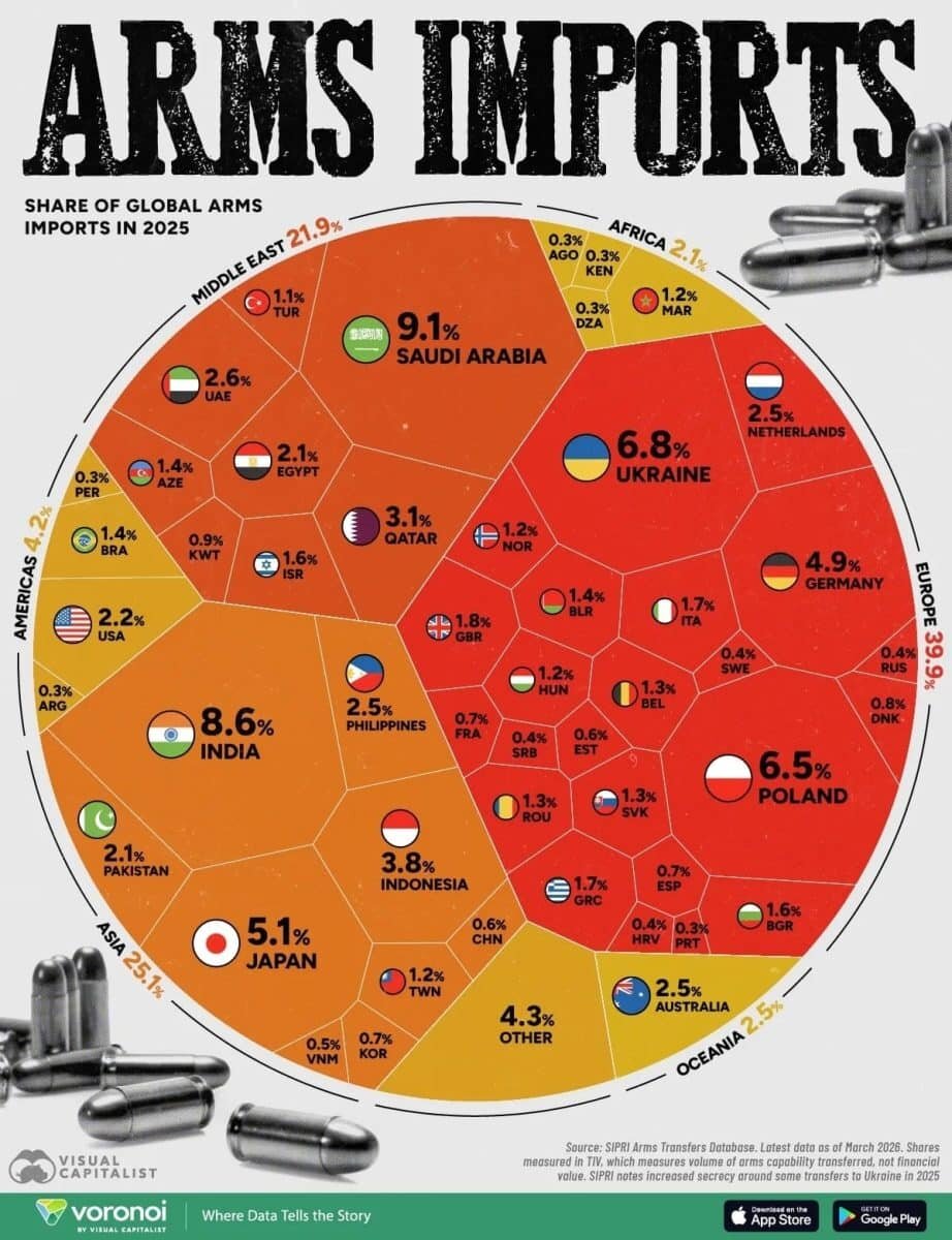 Европа неожиданно вышла в лидеры На инфографике сразу бросается в глаза главный сдвиг: крупнейшим регионом по доле мирового импорта оружия стала Европа — 39,9%. Для сравнения, Азия занимает 25,1%, Ближний Восток — 21,9%, Америки — 4,2%, Африка — 2,1%. На уровне стран особенно выделяются Саудовская Аравия с 9,1%, Индия с 8,6%, Украина с 6,8%, Польша с 6,5% и Германия с 4,9%. Это хорошо ложится на свежие данные SIPRI: институт сообщает, что в 2021–2025 годах Европа впервые за многие десятилетия стала крупнейшим регионом по импорту вооружений, а её закупки по сравнению с предыдущим пятилетием выросли более чем втрое. Общий объём международных поставок крупных вооружений при этом вырос на 9,2% по сравнению с 2016–2020 годами. Ещё одна причина роста рынка в том, что вооружения становятся всё сложнее и дороже. Сегодня армии нужны не просто пушки, бронемашины и самолёты, а высокоточные ракеты, беспилотники, системы связи, разведки, радиоэлектронной борьбы, спутникового сопровождения и противо