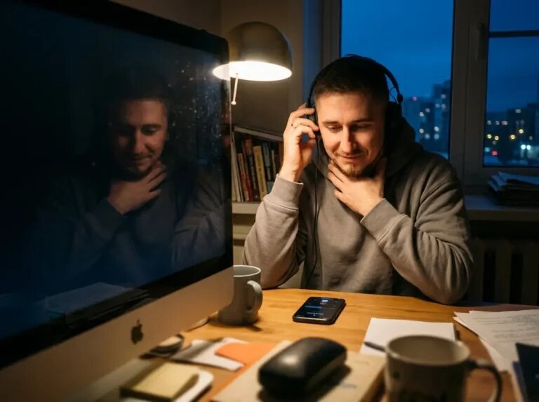 Я нажимаю «воспроизвести» — и в первые секунды сжимаюсь. Голос на записи кажется чужим. Выше. Тоньше. Как будто я младше и менее уверен, чем чувствую себя изнутри. В голове вспыхивает: «Почему голос на записи такой странный? Это правда я?»
