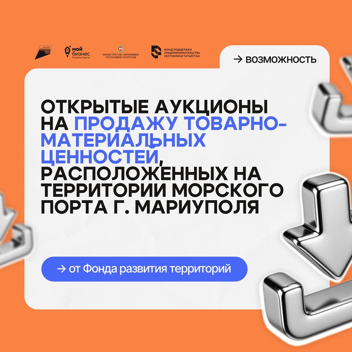 📢 Публично-правовая компания «Фонд развития территорий» объявляет о проведении открытых аукционов на продажу товарно-материальных ценностей, расположенных на территории морского порта г. Мариуполя 🔍 В рамках аукционов доступны: • 2 510 рулонов горячекатаных • 68 рулонов холоднокатаных в пачках • 677 рулонов холоднокатаных • 1 049 листов горячекатаных в пачках • 1 650 листов горячекатаных • около 1 585 тонн каолина навалом 💼 Участие в торгах — отличная возможность для бизнеса расширить свои ресурсы и укрепить позиции на рынке! 📅 Аукционы проводятся на электронной торговой площадке АО «Сбербанк-АСТ»: https://utp.sberbank-ast.ru 📞 Для получения дополнительной информации обращайтесь к Ковалеву Константину Владимировичу по телефону: +7 (912) 869-62-90 или по e-mail: tmc@fondrt.ru. Следите за новостями в Мой бизнес | Республика Татарстан, узнать о мерах поддержки можно по номеру Единого контакт-центра 8 (843) 524-90-90 📲Центр «Мой Бизнес» в МАХ