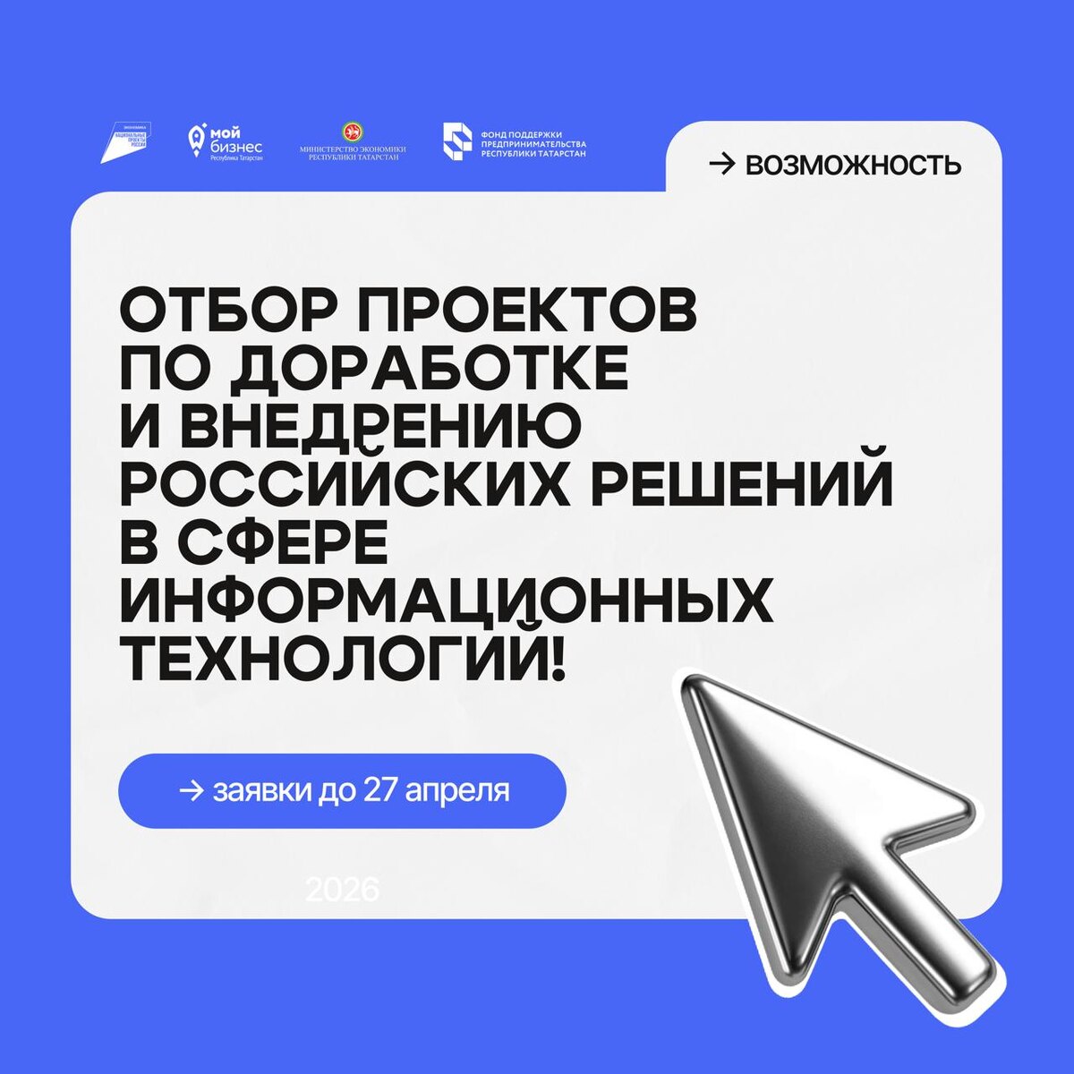 🔍 Если у вас есть идеи, которые могут стать основой для создания инновационных IT-решений, не упустите возможность получить государственную финансовую поддержку в форме гранта от Российского фонда развития информационных технологий (РФРИТ). 🗓️ Прием заявок: с 26 марта по 27 апреля 2026 года (до 9:00 по московскому времени) через систему «Электронный бюджет». 📜 Подробности о проведении конкурсного отбора можно найти по ссылке: Объявление о конкурсе. ❓ Если у вас есть вопросы, пишите на электронную почту ozp@rfrit.ru или звоните по телефону: +7(495)134-44-02. Не упустите шанс реализовать свой проект и внести вклад в цифровое будущее нашей страны! 💡 Следите за новостями в Мой бизнес | Республика Татарстан, узнать о мерах поддержки можно по номеру Единого контакт-центра 8 (843) 524-90-90 📲Центр «Мой Бизнес» в МАХ