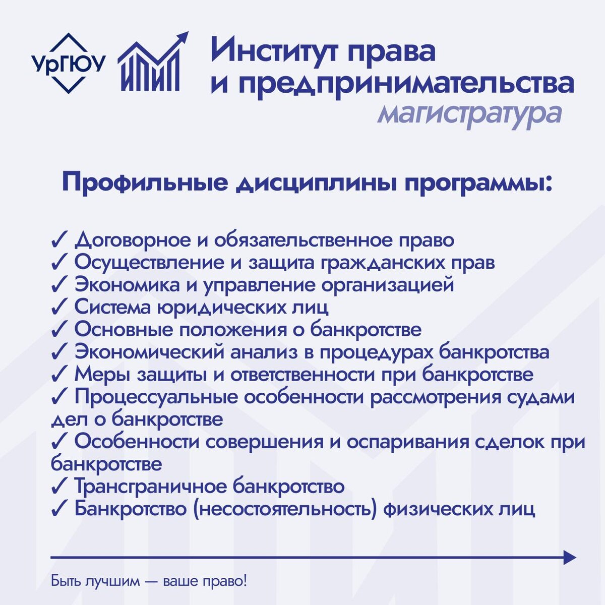 ». Программа ориентирована на подготовку специалистов в сфере несостоятельности (банкротства), включая комплексное изучение материальных, процессуальных и публично-правовых аспектов. 💎Содержание обучения: — основные положения о банкротстве, оспаривание сделок и меры ответственности; — процессуальные особенности рассмотрения дел о банкротстве; — банкротство физических лиц, отдельных категорий должников и трансграничное банкротство; — экономический анализ в процедурах банкротства; — уголовно-правовая защита и расследование должностных преступлений; — договорное право, система юридических лиц, защита гражданских прав. 💎Форма обучения и сроки: — очная форма - 2 года; — заочная форма - 2 года 3 месяца. 💎Приём документов: с 20 июня по 6 августа (до 14 августа на договорную форму обучения). Подробная информация о поступлении: usla.ru/priem/