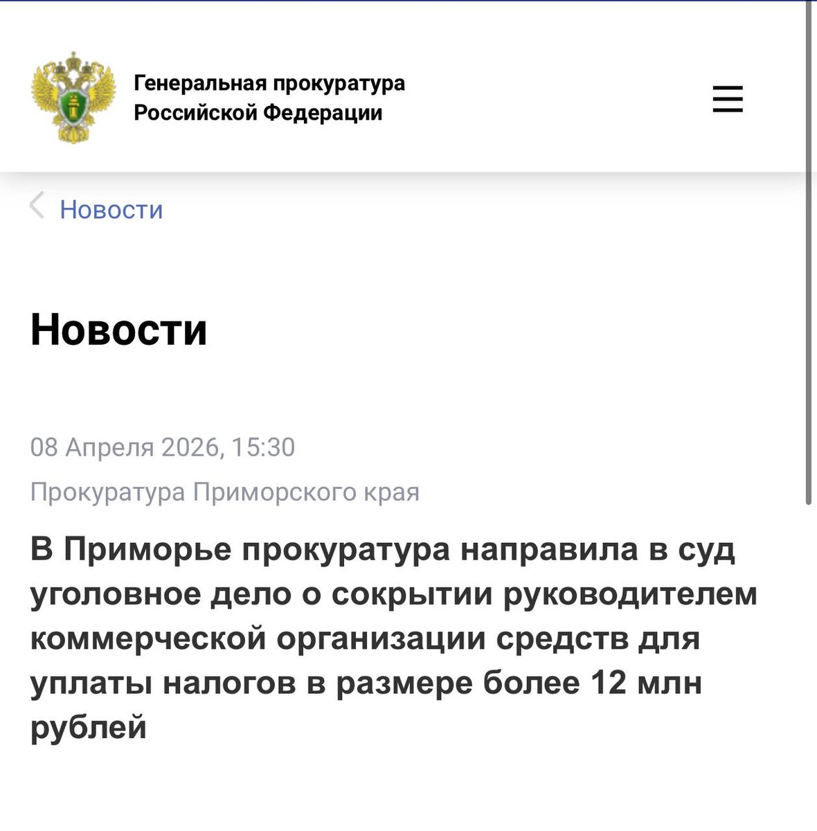 размере более 12 млн рублей Прокуратура Приморского края утвердила обвинительное заключение в отношении руководителя коммерческой организации. Он обвиняется по ч. 1 ст. 199.2 УК РФ (сокрытие денежных средств организации, за счет которых должно производиться взыскание налогов в крупном размере). По версии следствия, с июля 2022 года по апрель 2024 года обвиняемый, имея долги по налоговым платежам на общую сумму свыше 12 млн рублей, с целью сокрытия доходов для погашения имеющейся недоимки проводил расчеты с контрагентами, минуя расчетные счета организации. В результате общая сумма сокрытых средств составила более 12 млн рублей. На имущество обвиняемого на сумму около 26 млн рублей наложен арест. Уголовное дело направлено в Лесозаводский районный суд для рассмотрения по существу. ❗️Информация размещена на сайте Генеральной прокуратуры Российской Федерации.