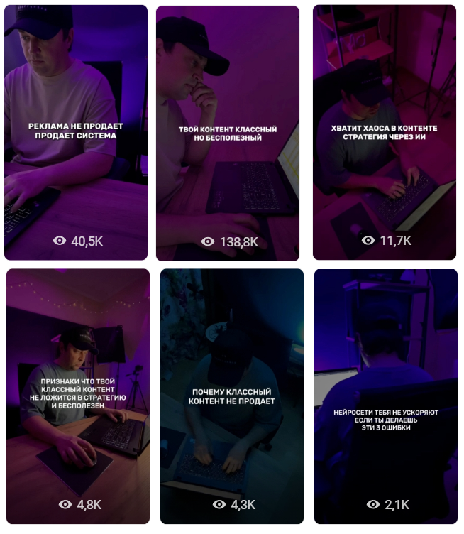 1. Этап — С помощью нейросетей за 2,5-3 часа мы создаем порядка 30-60 сценариев для ВК Клипов. Также порядка 30-60 текстовых каруселей для постов в группу ВК